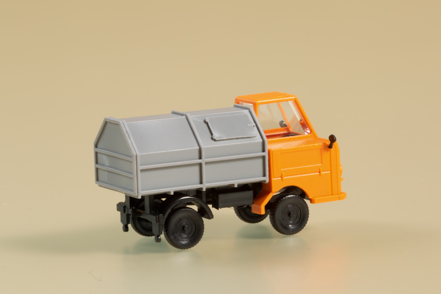 Diese Ausführung kam vorwiegend zum Einsatz, um kleine Abfallmengen, z. B. aus Papierkörben, zu entsorgen. Mit vorbildgerechter Bereifung, Spiegel und Hängerkupplung.