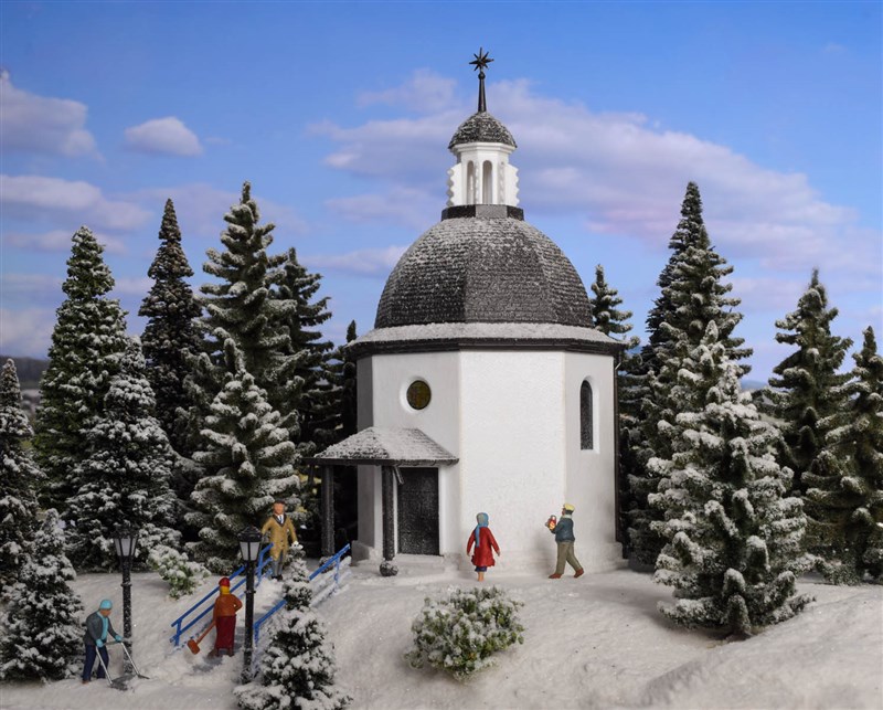 Weihnachten ohne das Lied Stille Nacht! Heilige Nacht! ist schlichtweg nicht vorstellbar. Am 24. Dezember 1818 führte der Dorfschullehrer und Organist Franz Xaver Gruber und der Hilfspriester Joseph Mohr in der Kirche St. Nikolaus in Oberndorf bei Salzburg dieses Weihnachtslied erstmals auf. Zur Jahrhundertwende wurde die Kirche St. Nikolaus abgerissen und an ihrer Stelle die Stille-Nacht-Gedächtniskapelle errichtet. Die Original Stille-Nacht Gedächtniskapelle im Maßstab 1:87 H0 von Vollmer ist ein Bausatz mit vielen Extras wie z. B. Sockelbirne und Kunstschnee. Maße: L 11 x B 8 x H 16 cm.