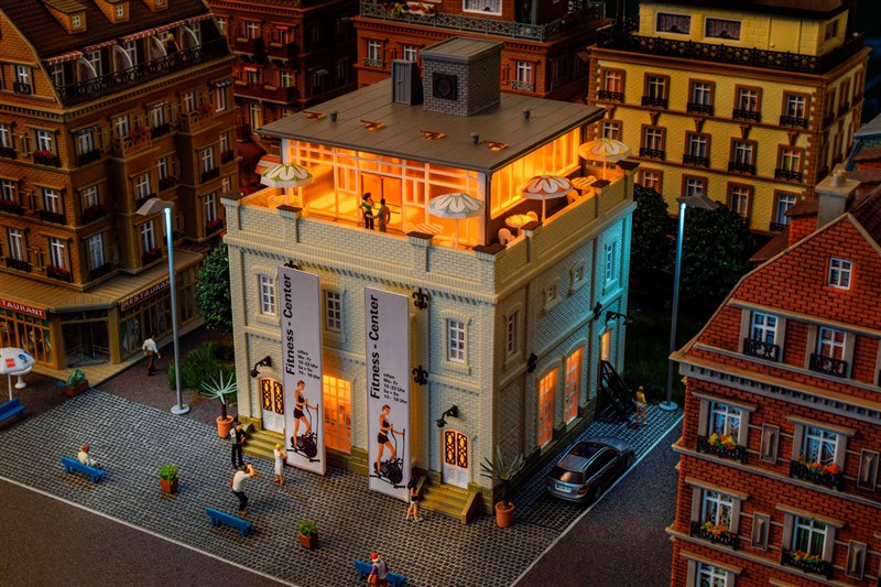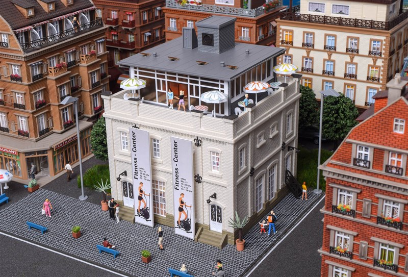 Dieses Fitness-Center ist in einem modernisierten Altbau untergebracht. Auf dem Dach befindet sich der große Gymnastik- und Yoga-Saal und auf der Dachterrasse kann man sich nach dem Sport erholen. Dieses Gebäude kann gut mit den beiden Penthäusern mit Dachterrasse Art. 43611 und 46312 kombiniert werden. Maße: L 16 x B 15 x H 16,5 cm.